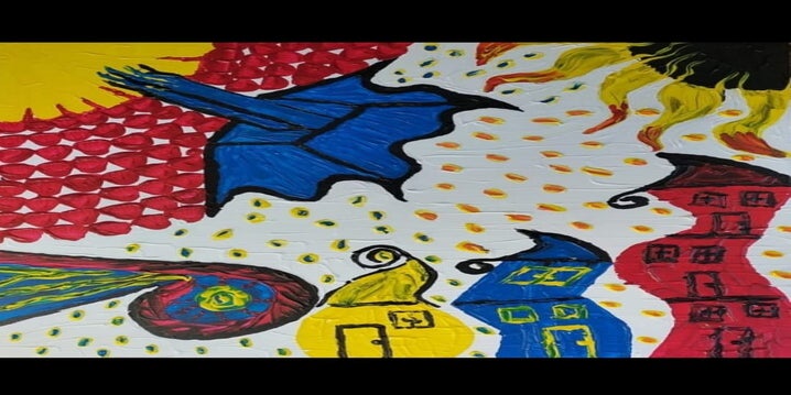 Everything in this work starting from the forms deviated from reality or changed indicates life. the dinosaur represents the life that existed millions of years ago and has always been there... the houses, each of them recalls something that belongs to life like a mushroom, the little yellow house, the coffee pot, the little blue house, the body of a woman the little red house, there are people living inside! the two suns to say that everything is part of the light of love to give life... a sun with rays bathed in black to indicate that there is also pain and there are burdens but then they are transformed by contact with life same with the light who is inside us and is endless