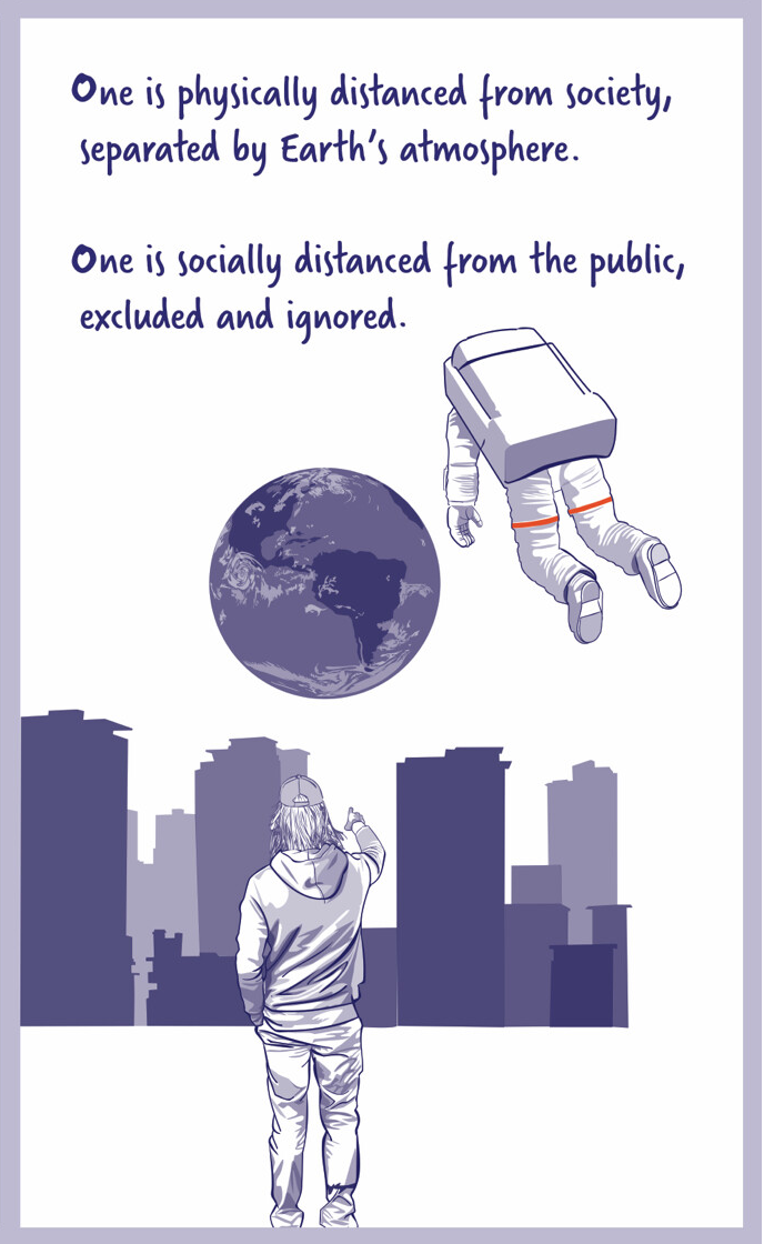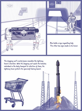 "The Nomad, which creates a metaphor between the wanderer lifestyles of an astronaut and homeless individual alike"