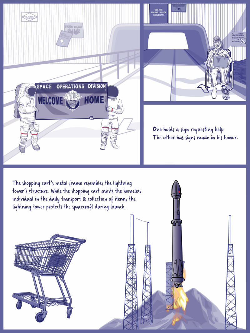 I imagined how the gridded panels of satellites could dissipate into shopping carts. One is physically removed from the public – due to the distance and barriers of space – whereas the other is socially removed from the public – due to marginalization. My animation and accompanying image stills unabashedly raise awareness of the glory society gives to one and not the other.
