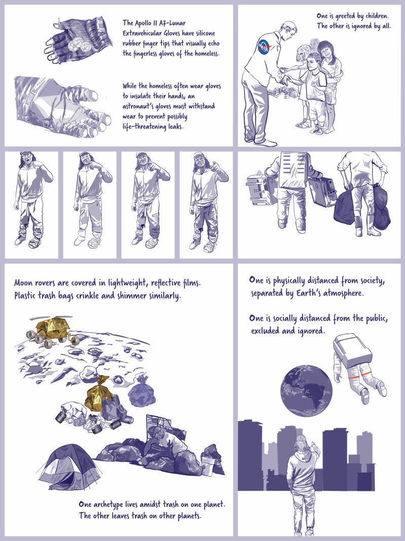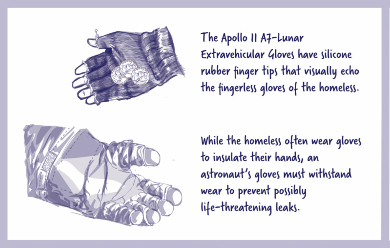 The exposed fingertips of the homeless’ gloves became the finger caps of astronaut gloves. The bulky and make-shift aesthetic of the two archetypes’ clothing attested to survival needs.