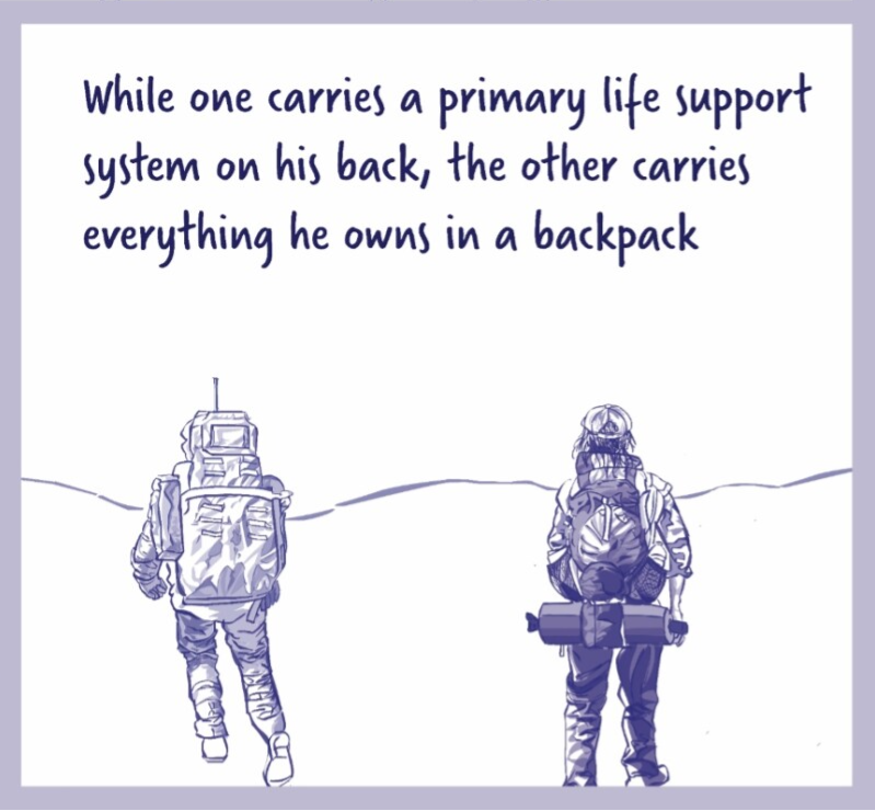 The nomadic practice of carrying everything you need is embodied in both backpack and Primary Life Support Subsystem.